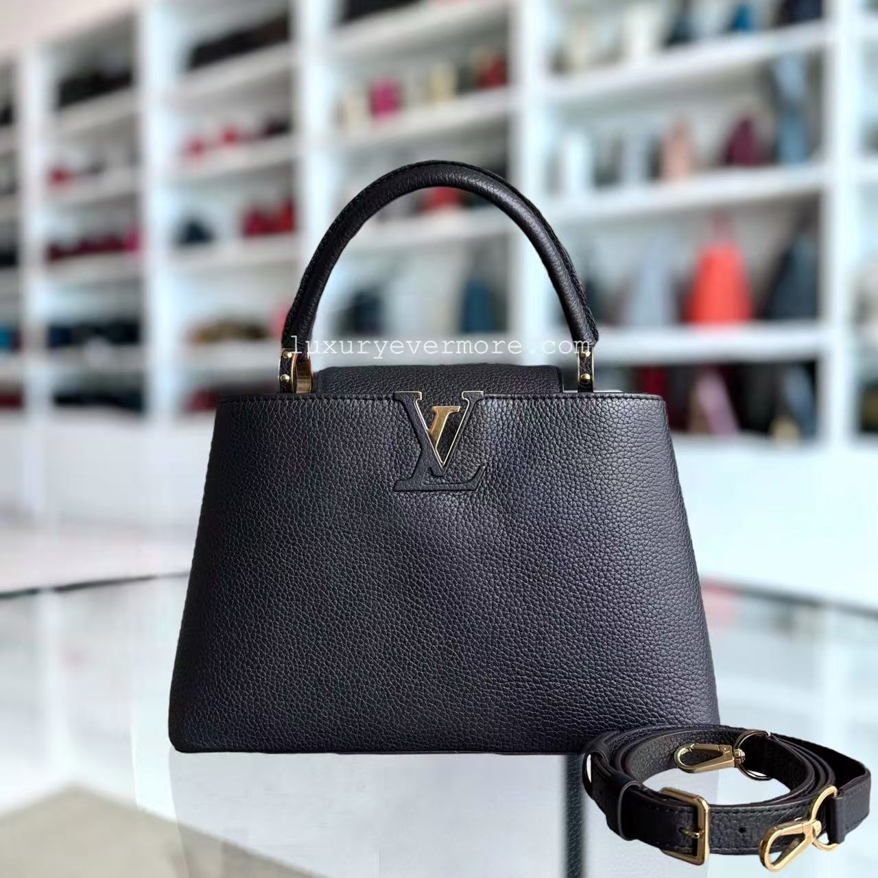 Elegant and timeless, the Louis Vuitton Capucines MM in Taurillon grained calfskin exudes luxury with its sleek black finish and exquisite gold hardware. Perfect for any occasion.