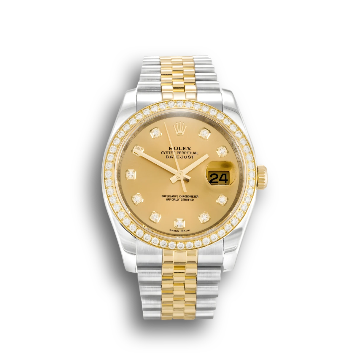 BrandRolexCollectionDatejustModel116243GenderMensMovementAutomaticCase size36 MMCase materialSteel & Yellow Gold set with DiamondsBracelet materialSteel & Yellow Gold (Jubilee)Dial typeChampagne DiamondWater resistanceWater Resistant