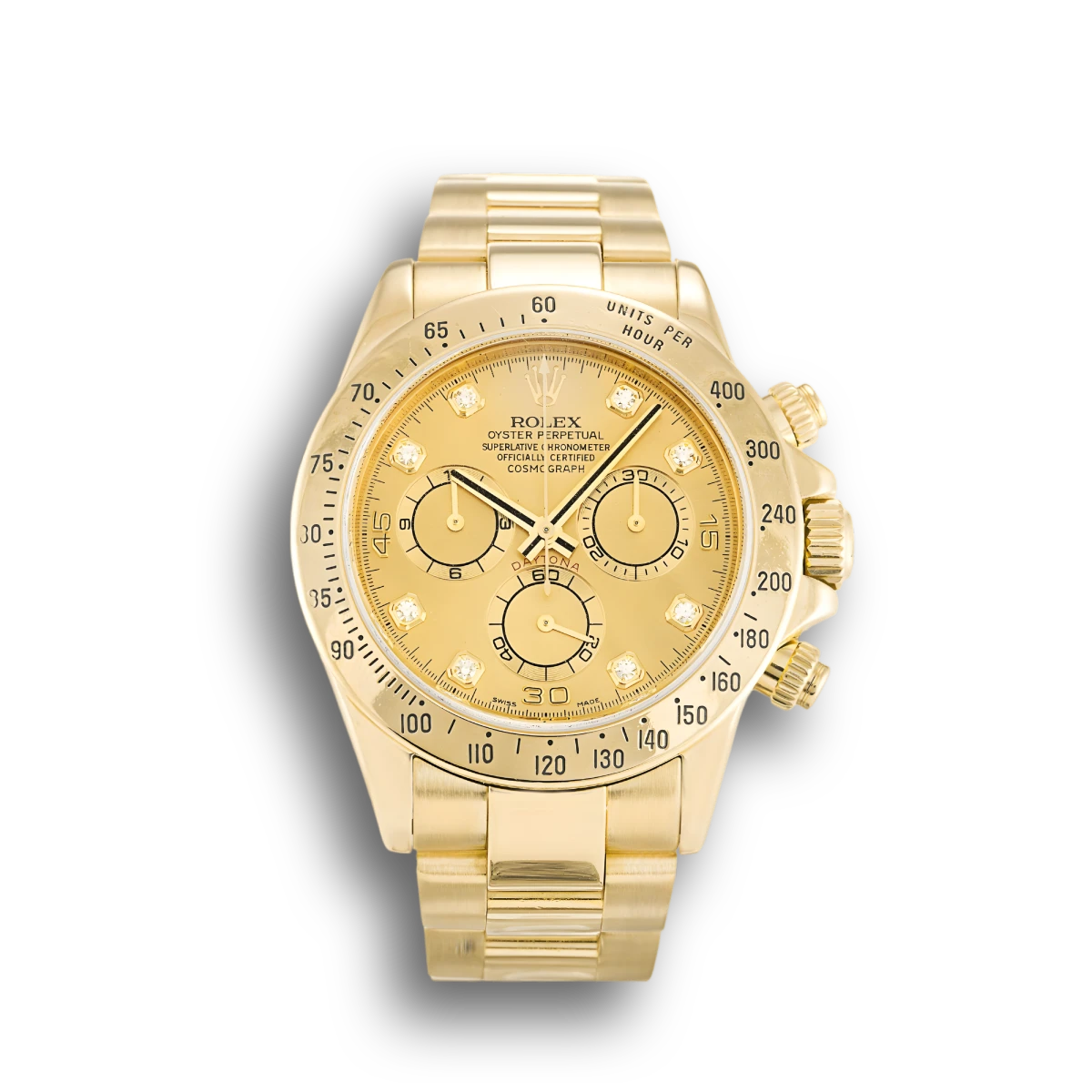 BrandRolexCollectionDaytonaModel116528GenderMensMovementKinetic (Automatic)Case size40 MMCase materialYellow GoldBracelet materialYellow Gold (OysterLock)Dial typeChampagne DiamondWater resistanceWater Resistant